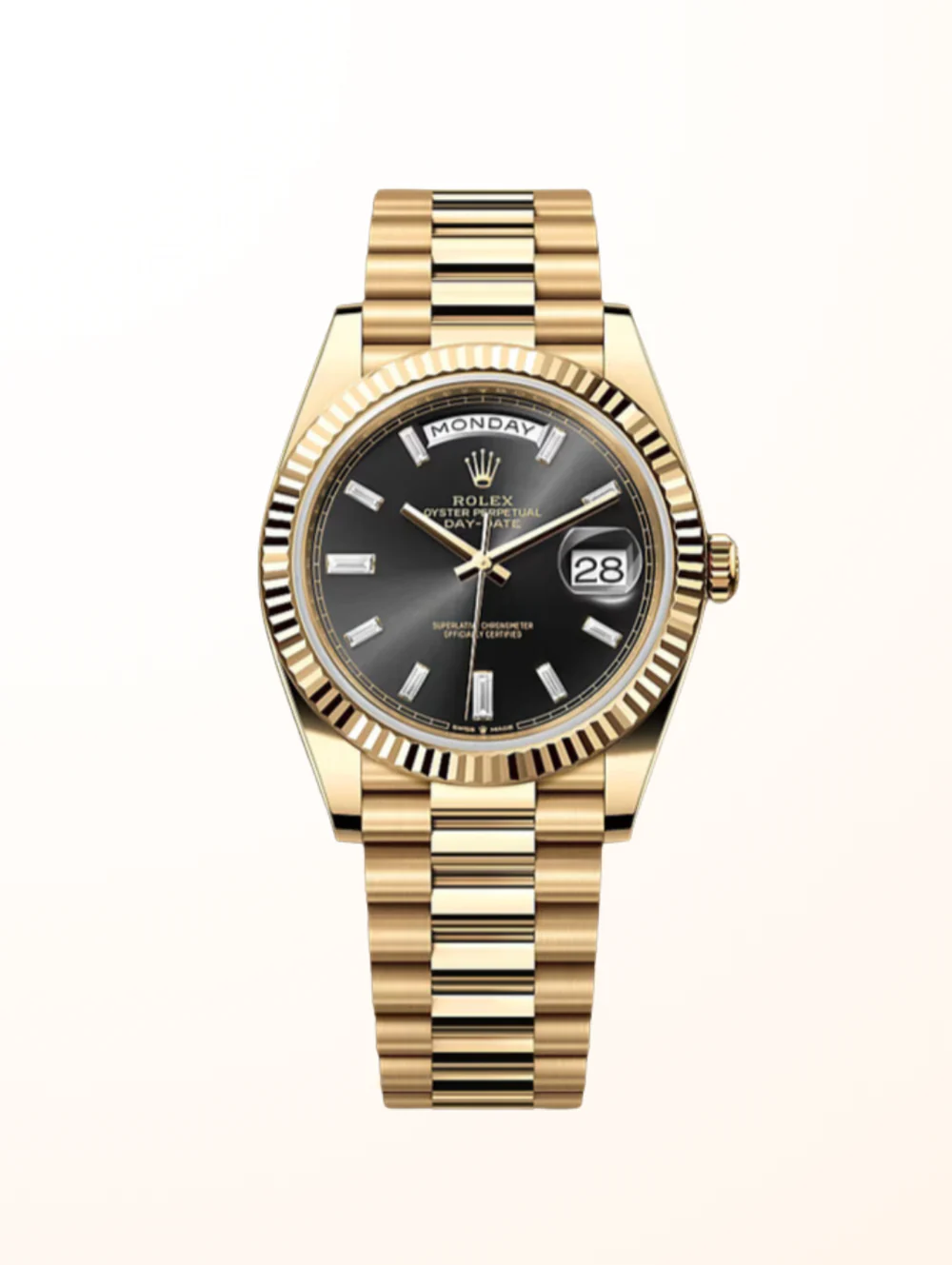O Rolex Day-Date 40 é o auge da elegância e do prestígio, com uma caixa de 40 mm feita em ouro 18k ou platina. Seu mostrador distinto exibe o dia às 12 horas e a data às 3 horas, ambos ampliados pela lente Cyclops. Alimentado pelo movimento Calibre 3255 com reserva de marcha de 70 horas, ele garante uma precisão excepcional. A pulseira President, com fecho Crownclasp oculto e design à prova d’água e resistente a arranhões, faz do Day-Date 40 um símbolo de luxo e sofisticação.