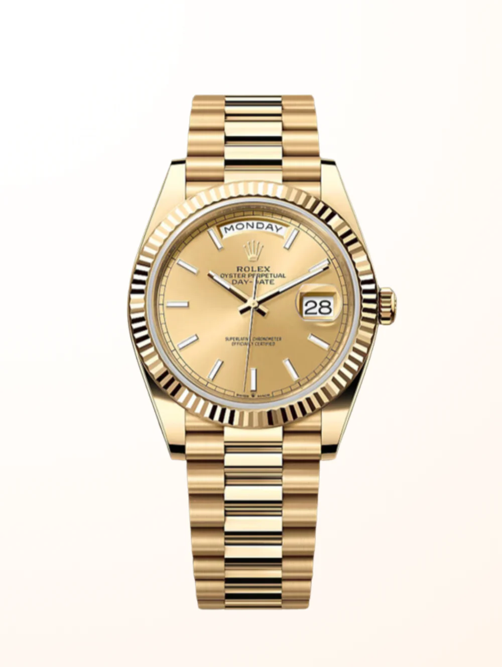 O Rolex Day-Date 40 é o auge da elegância e do prestígio, com uma caixa de 40 mm feita em ouro 18k ou platina. Seu mostrador distinto exibe o dia às 12 horas e a data às 3 horas, ambos ampliados pela lente Cyclops. Alimentado pelo movimento Calibre 3255 com reserva de marcha de 70 horas, ele garante uma precisão excepcional. A pulseira President, com fecho Crownclasp oculto e design à prova d’água e resistente a arranhões, faz do Day-Date 40 um símbolo de luxo e sofisticação.