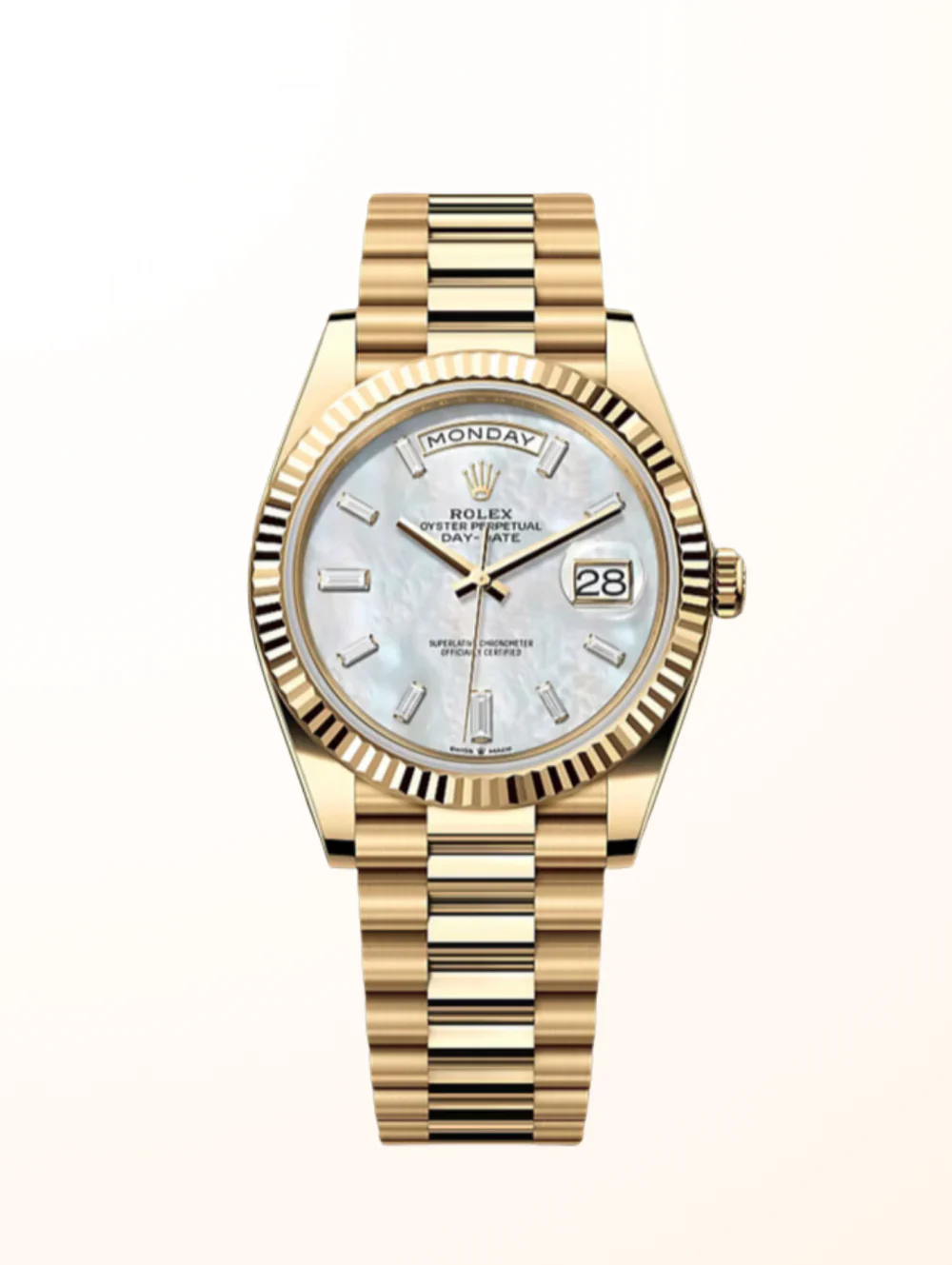 O Rolex Day-Date 40 é o auge da elegância e do prestígio, com uma caixa de 40 mm feita em ouro 18k ou platina. Seu mostrador distinto exibe o dia às 12 horas e a data às 3 horas, ambos ampliados pela lente Cyclops. Alimentado pelo movimento Calibre 3255 com reserva de marcha de 70 horas, ele garante uma precisão excepcional. A pulseira President, com fecho Crownclasp oculto e design à prova d’água e resistente a arranhões, faz do Day-Date 40 um símbolo de luxo e sofisticação.