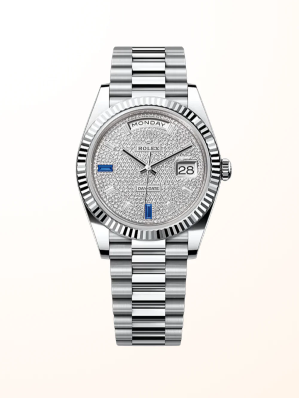 O Rolex Day-Date 40 é o auge da elegância e do prestígio, com uma caixa de 40 mm feita em ouro 18k ou platina. Seu mostrador distinto exibe o dia às 12 horas e a data às 3 horas, ambos ampliados pela lente Cyclops. Alimentado pelo movimento Calibre 3255 com reserva de marcha de 70 horas, ele garante uma precisão excepcional. A pulseira President, com fecho Crownclasp oculto e design à prova d’água e resistente a arranhões, faz do Day-Date 40 um símbolo de luxo e sofisticação.