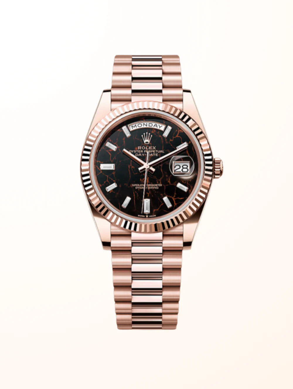 O Rolex Day-Date 40 é o auge da elegância e do prestígio, com uma caixa de 40 mm feita em ouro 18k ou platina. Seu mostrador distinto exibe o dia às 12 horas e a data às 3 horas, ambos ampliados pela lente Cyclops. Alimentado pelo movimento Calibre 3255 com reserva de marcha de 70 horas, ele garante uma precisão excepcional. A pulseira President, com fecho Crownclasp oculto e design à prova d’água e resistente a arranhões, faz do Day-Date 40 um símbolo de luxo e sofisticação.