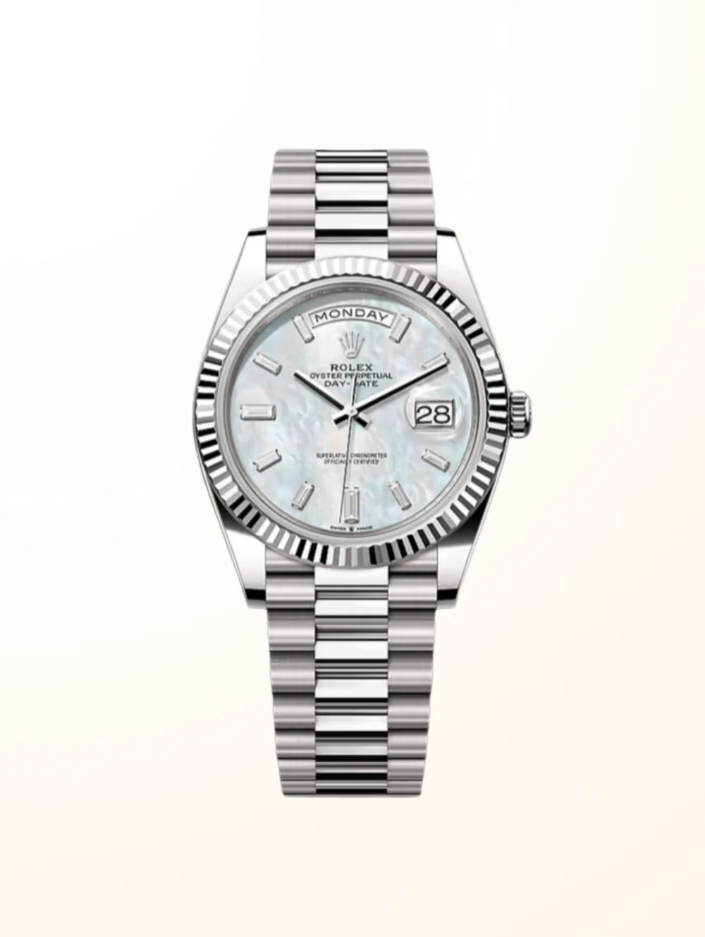 O Rolex Day-Date 40 é o auge da elegância e do prestígio, com uma caixa de 40 mm feita em ouro 18k ou platina. Seu mostrador distinto exibe o dia às 12 horas e a data às 3 horas, ambos ampliados pela lente Cyclops. Alimentado pelo movimento Calibre 3255 com reserva de marcha de 70 horas, ele garante uma precisão excepcional. A pulseira President, com fecho Crownclasp oculto e design à prova d’água e resistente a arranhões, faz do Day-Date 40 um símbolo de luxo e sofisticação.