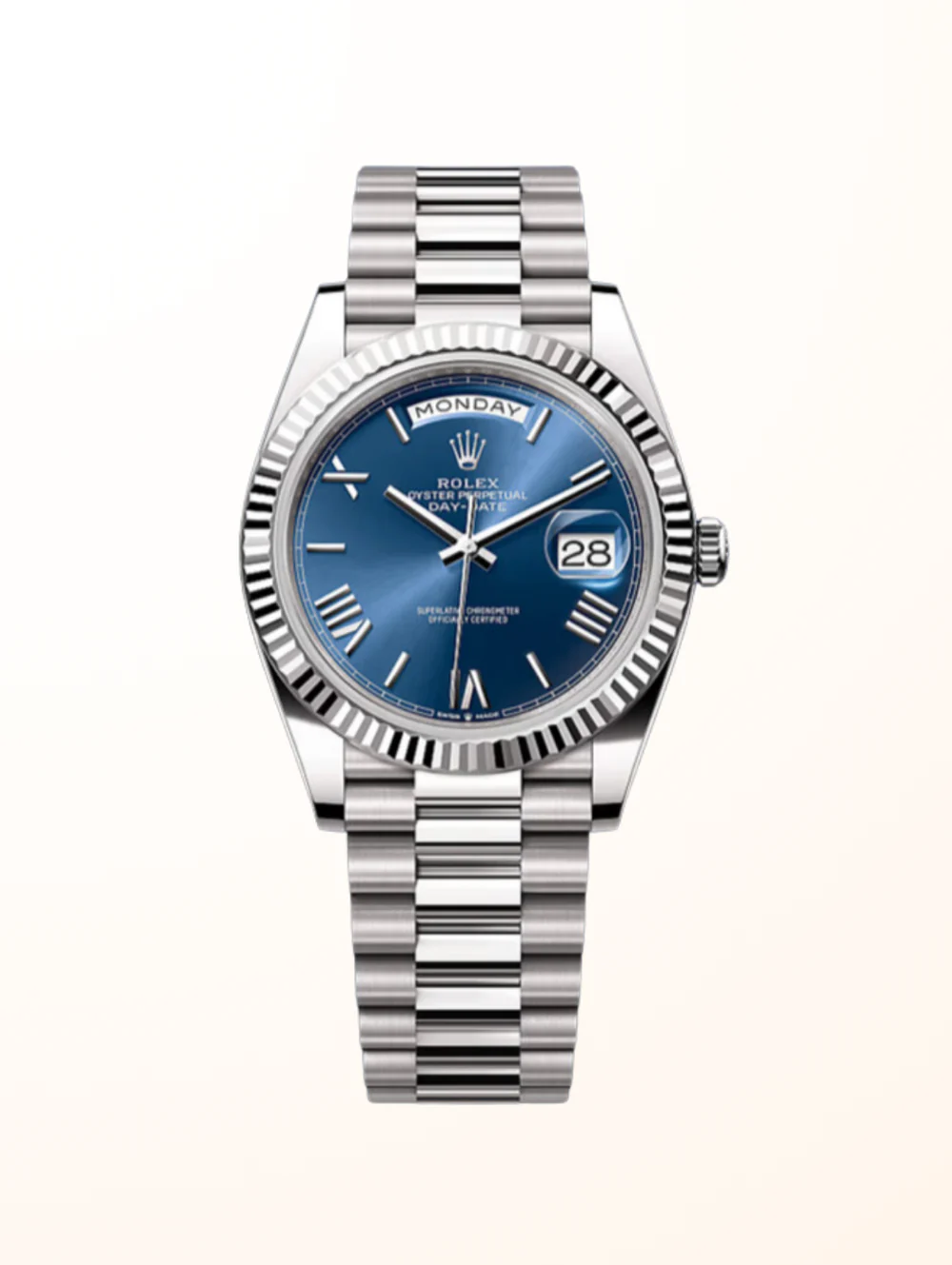 O Rolex Day-Date 40 é o auge da elegância e do prestígio, com uma caixa de 40 mm feita em ouro 18k ou platina. Seu mostrador distinto exibe o dia às 12 horas e a data às 3 horas, ambos ampliados pela lente Cyclops. Alimentado pelo movimento Calibre 3255 com reserva de marcha de 70 horas, ele garante uma precisão excepcional. A pulseira President, com fecho Crownclasp oculto e design à prova d’água e resistente a arranhões, faz do Day-Date 40 um símbolo de luxo e sofisticação.