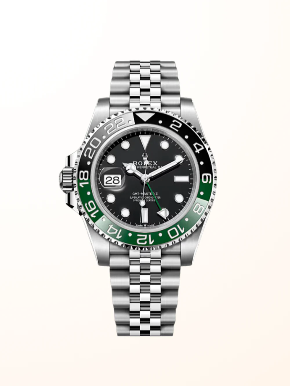 O Rolex GMT-Master II é um relógio de viagem de primeira linha, com uma caixa de 40 mm feita em aço inoxidável, Rolesor ou ouro 18k. Seu mostrador diferenciado oferece dois fusos horários e uma luneta giratória de 24 horas. Alimentado pelo movimento Calibre 3285 com reserva de marcha de 70 horas, garante precisão e confiabilidade. A pulseira Oyster com extensão Easylink e o design à prova d’água e resistente a arranhões fazem do GMT-Master II uma escolha versátil e elegante para viajantes e profissionais.