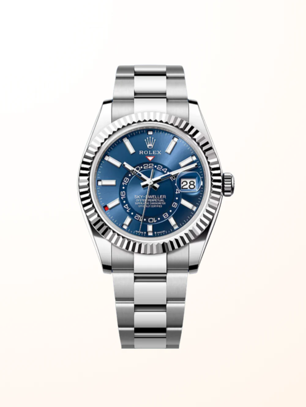 O Rolex Sky-Dweller é um sofisticado relógio de viagem, com uma caixa de 42 mm feita de materiais premium como aço inoxidável, Rolex ou ouro 18k. Seu mostrador inovador exibe dois fusos horários e um calendário anual com janela de data e indicador de mês. Alimentado pelo movimento Calibre 9001 com reserva de marcha de 72 horas, garante uma cronometragem precisa e confiável. A confortável pulseira Oyster e o design à prova d’água e resistente a arranhões fazem do Sky-Dweller uma escolha luxuosa e prática para viajantes globais.